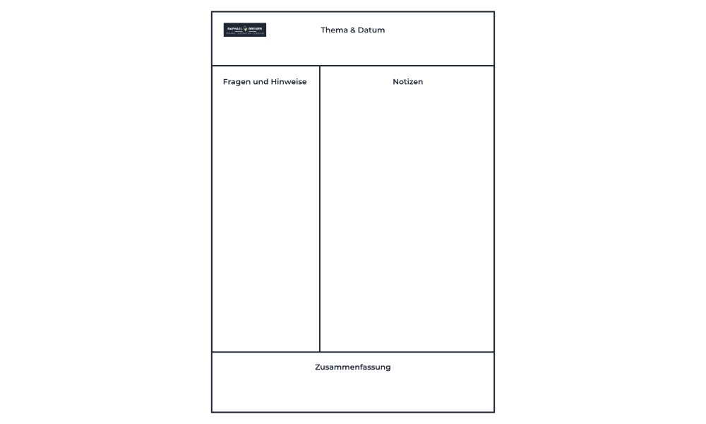 • Blatt korrekt vorbereiten (Kopfzeile, Notizspalte, Fragen-Spalte, Zusammenfassung)