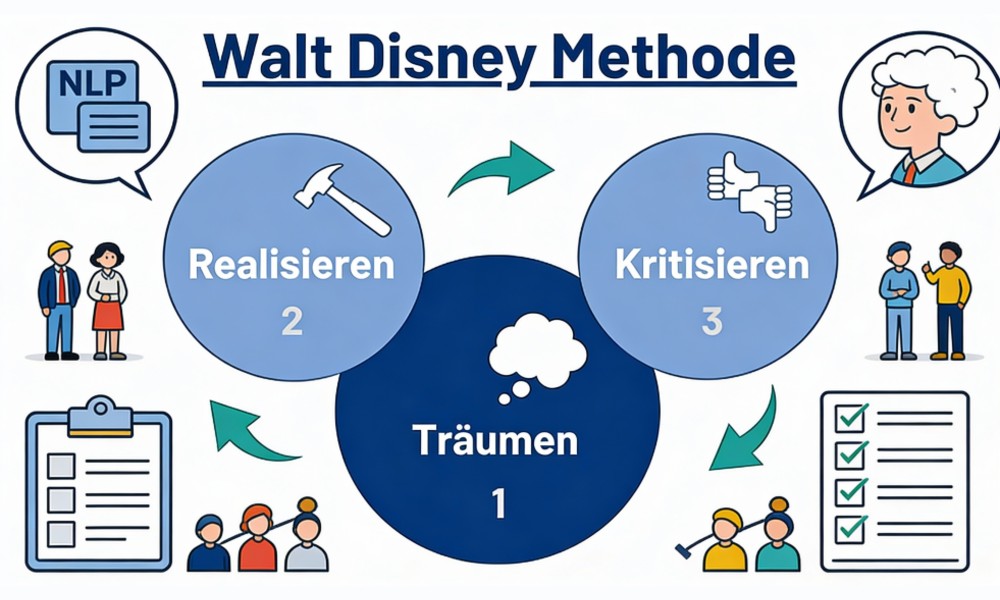 Die Walt-Disney-Strategie ist eine aus dem NLP stammende, wirkungsvolle Methode, um Ideen strukturiert zu entwickeln, realistisch zu planen und konstruktiv zu überprüfen. Sie basiert auf drei klar getrennten Denkrollen – Träumer, Realist und Kritiker –, die nacheinander eingenommen werden. Dadurch entsteht ein Prozess, der Kreativität fördert, ohne die Umsetzbarkeit aus den Augen zu verlieren. Besonders im Coaching, im beruflichen Kontext und in der persönlichen Entwicklung bietet die Strategie einen hohen Praxisnutzen, da sie Orientierung, Klarheit und Handlungssicherheit schafft. Die Walt-Disney-Methode hat ihren Ursprung in der Technik der sechs Denkhüte, die vom Philosophen Edward de Bono entwickelt wurde.